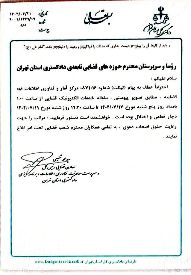 بخشنامه دادگستری تهران درباره قطعی سامانه عدل ایران از 17 تا 19 مهر 1404