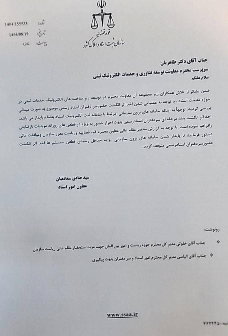 در ادامه این نامه آمده است که با توجه به گزارش ارایه شده به ریاست سازمان ثبت اسناد و املاک کشور و موافقت ایشان، فرآیند «اثر انگشت حضور سردفتران اسناد رسمی» متوقف شد.